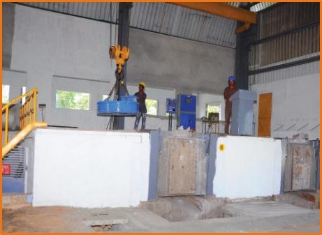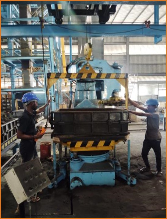 Charge material handling with Electromagnet. Metal pouring by EOT crane and Mono rail arrangement. SG iron treatment with Tandish cover method.